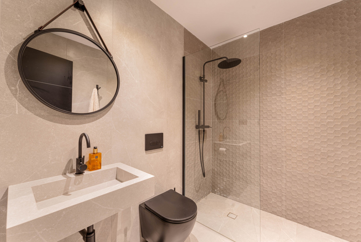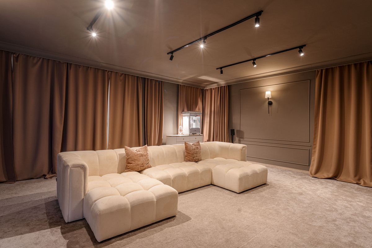 Upon entry, the villa welcomes you with a bright, open-plan layout. The ground floor comprises a high-end kitchen with real stone countertops, a stylish dining area, and a relaxing living space that connects seamlessly with the outdoor terraces and pool area. One guest bedroom and a functional home office are also found on this level. The upper floor is dedicated to the master suite and two additional bedrooms, all with large windows offering sea, garden and pool views. The basement includes a stylish home cinema and another guest suite, ideal for entertaining or accommodating visitors.