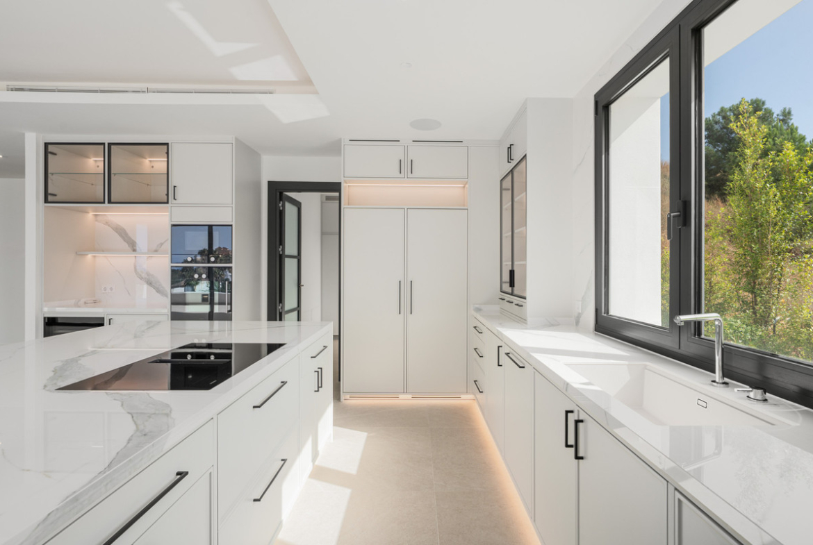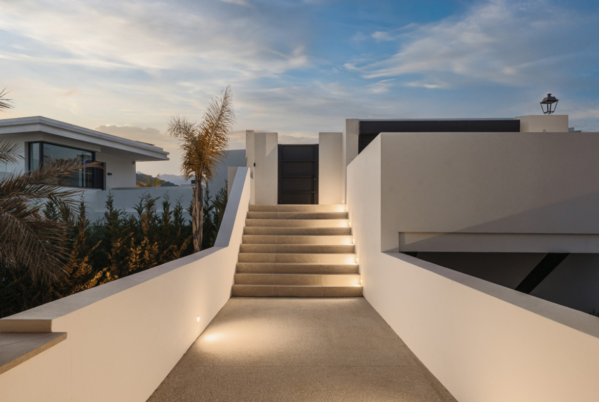 Villa Three, located in the distinguished La Resina Golf community within Estepona’s flourishing residential zone, is an architectural statement combining contemporary sophistication and practical luxury. Designed by the acclaimed Francisco Martínez Galván, this four-level residence encompasses an impressive total built area of 674 square meters. The interior offers 503 square meters of meticulously crafted living space, while an additional 171 square meters of terrace ensures a seamless transition between indoor elegance and open-air enjoyment.