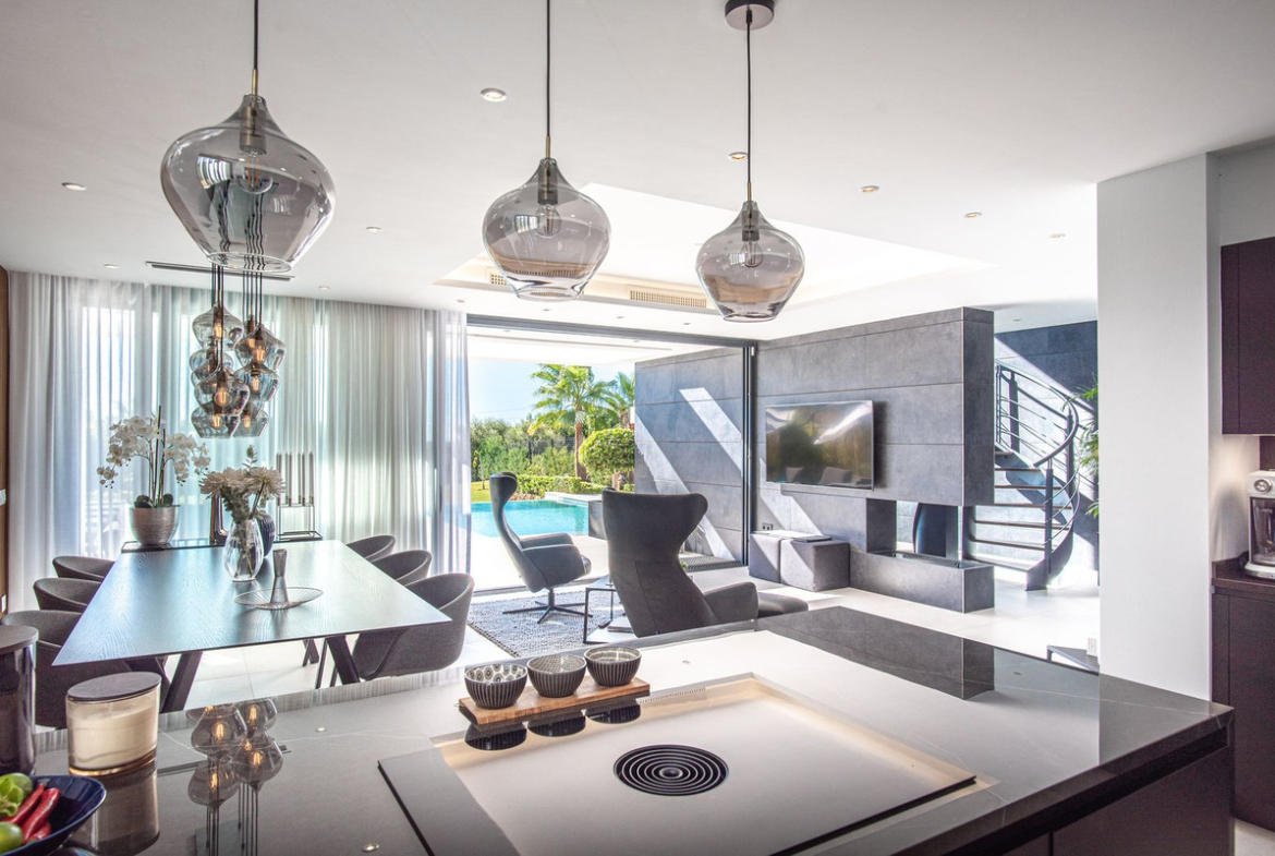 This 6-bedroom, 5-bathroom villa sits on a generous plot of over 1,000 m² with a built area of 383 m², plus an additional 150 m² of terraces. Enter through impressive iron doors into a spacious and bright living room, beautifully designed with bespoke interiors and floor-to-ceiling windows that flood the home with natural light.