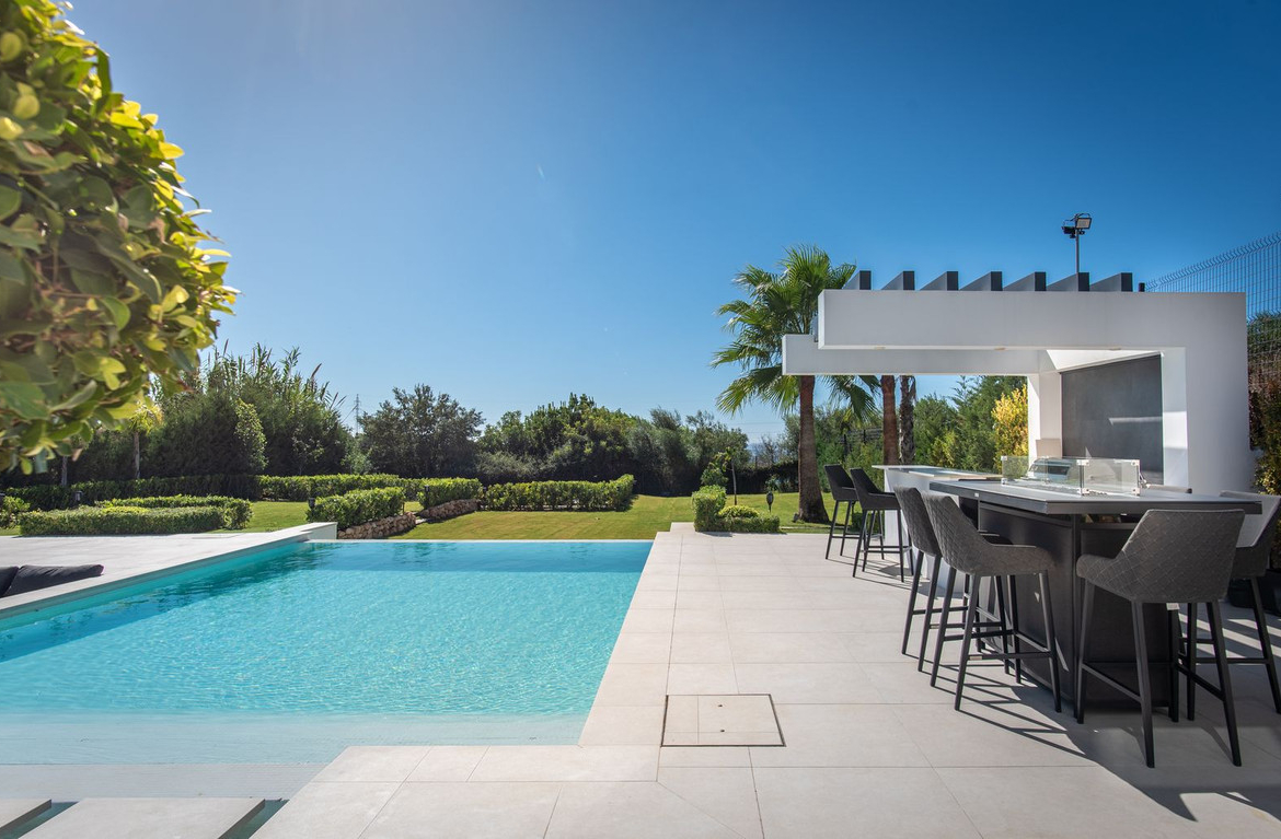 The villa features a generous terrace with a sunken lounge and fire pit, complemented by a private pool and an outdoor kitchen equipped with a gas BBQ, hot/cold tap, and dining area. From here, you can enjoy breathtaking views of the Mediterranean Sea and the golf course.