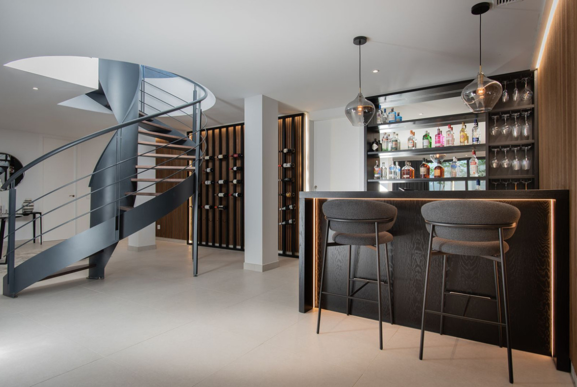 Upstairs, a sophisticated master suite opens onto its own terrace with gorgeous views. The impressive basement level is designed for entertainment, offering a TV area, wine bodega, and a cinema room.