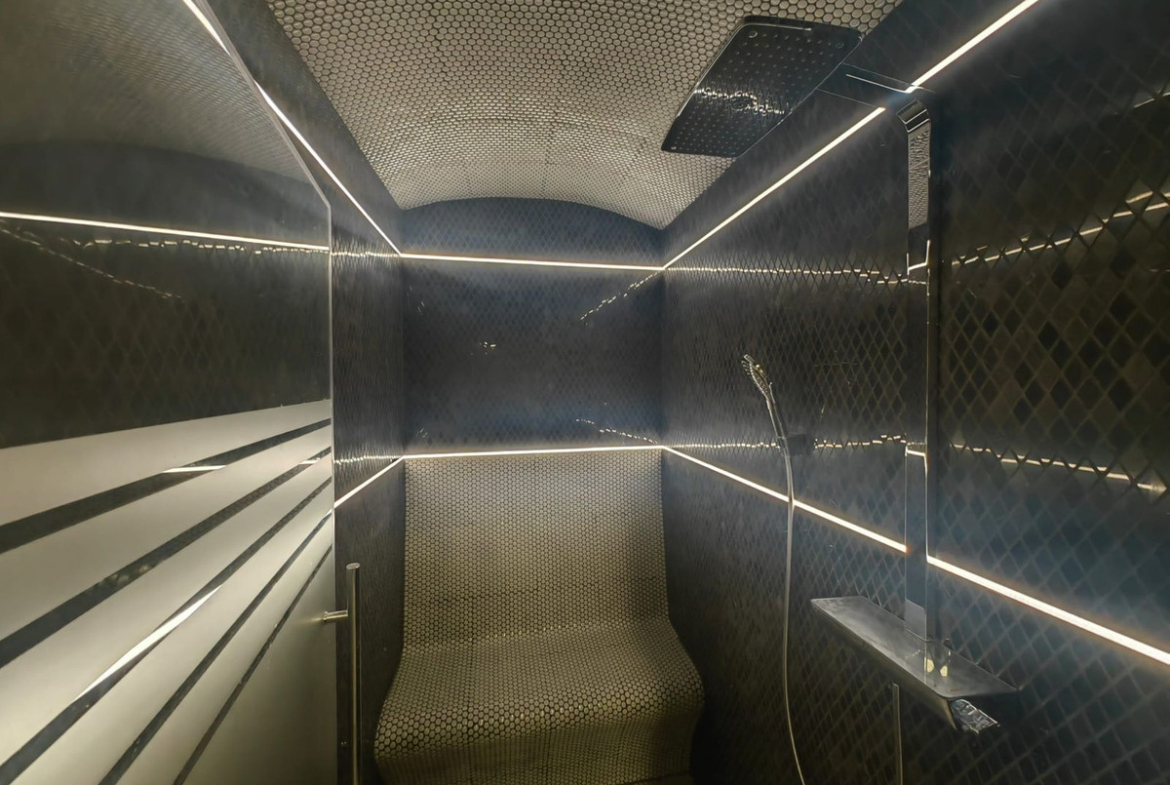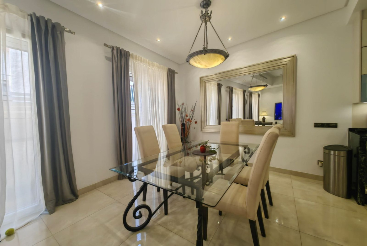 With entrances from both streets — including a private automated garage — this level offers parking for up to five cars, along with two utility rooms, a fully equipped gym, a Turkish bath, and a shower bathroom. The entrance lobby, flooded with soft natural light, provides access to the elevator and stairs leading to the main living areas.