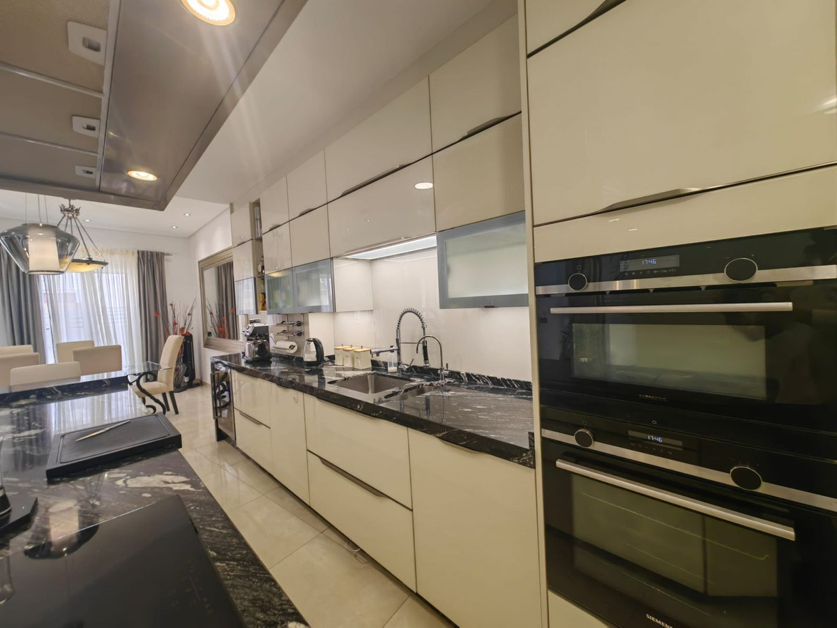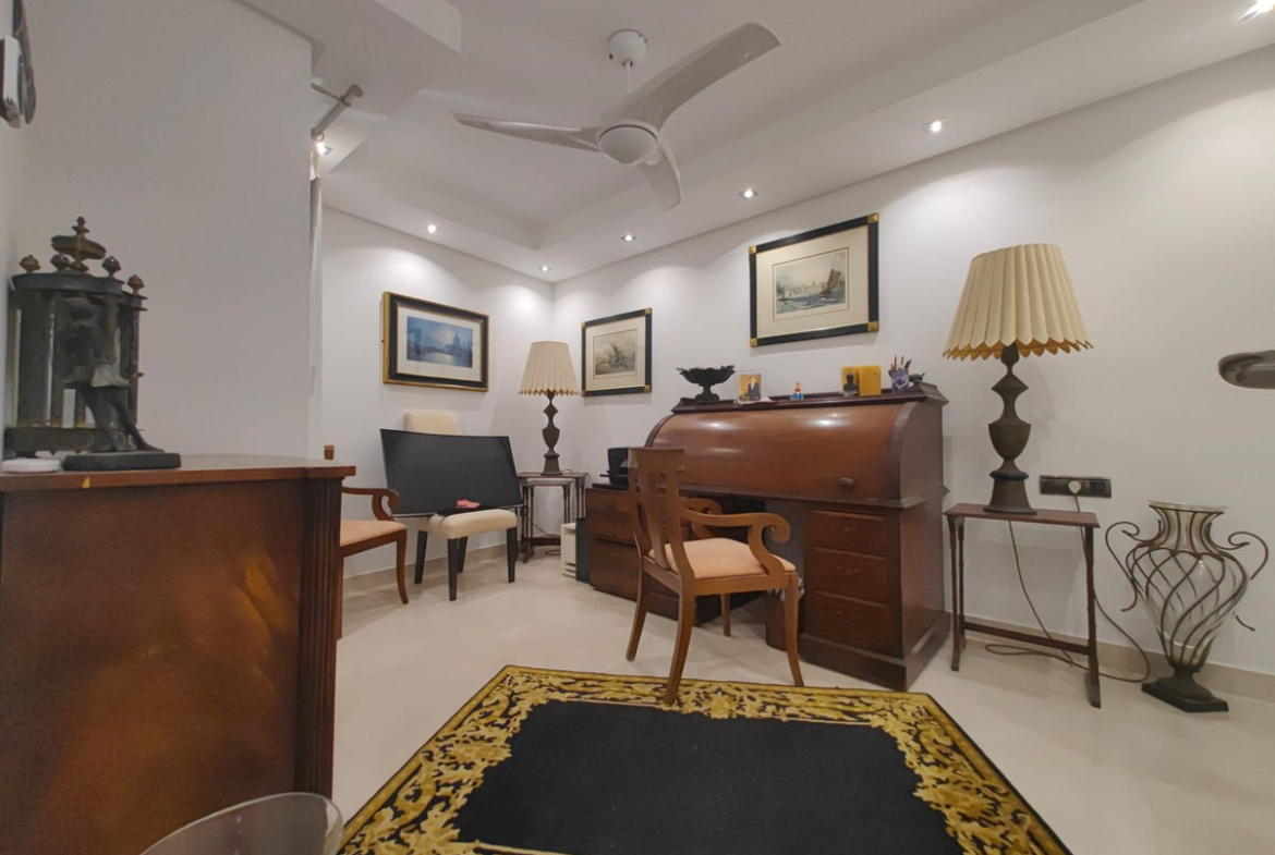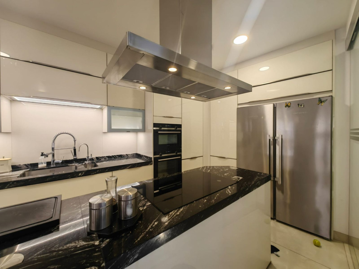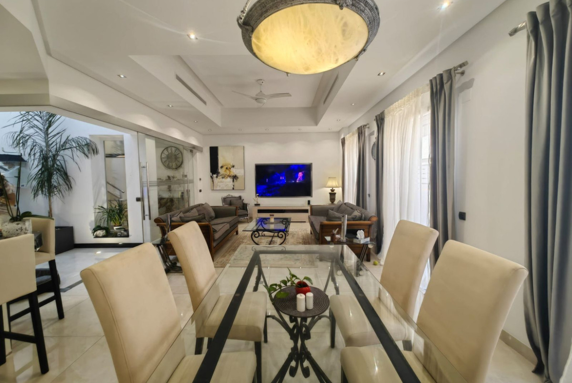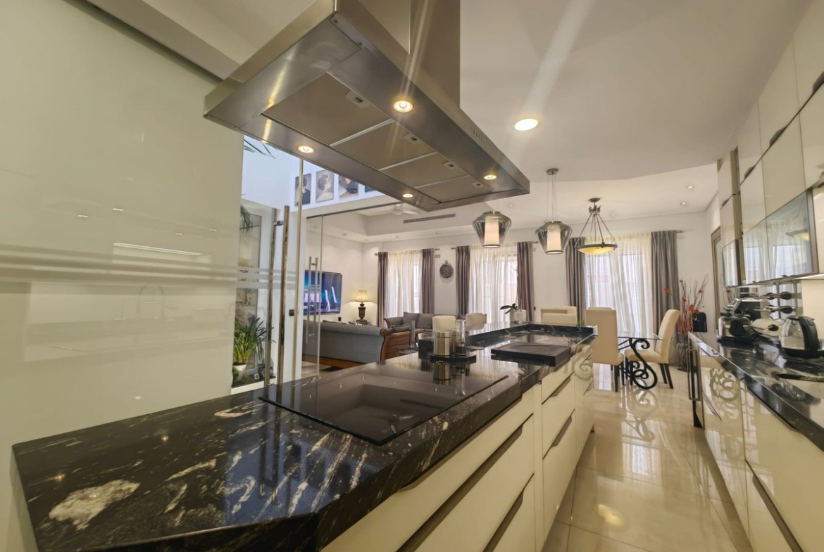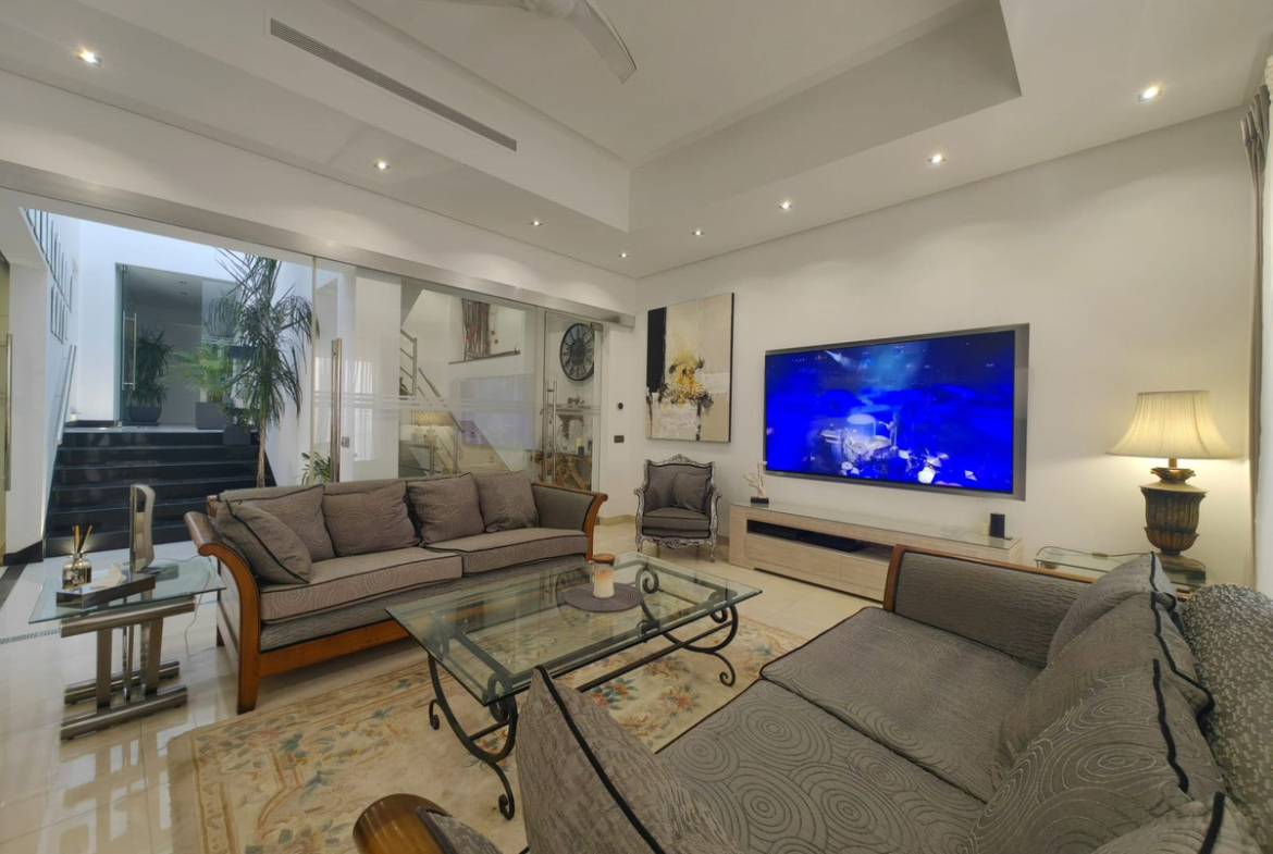A central feature of the home is the dramatic atrium, rising all the way to the glass rooftop and acting as the light-filled core of the villa. A wide glass door opens into a spacious lounge and TV area, dining room, and a designer Schmidt kitchen fitted with top-of-the-line appliances including a Liebherr refrigerator. This entire floor is bathed in daylight, offering seamless flow and openness.