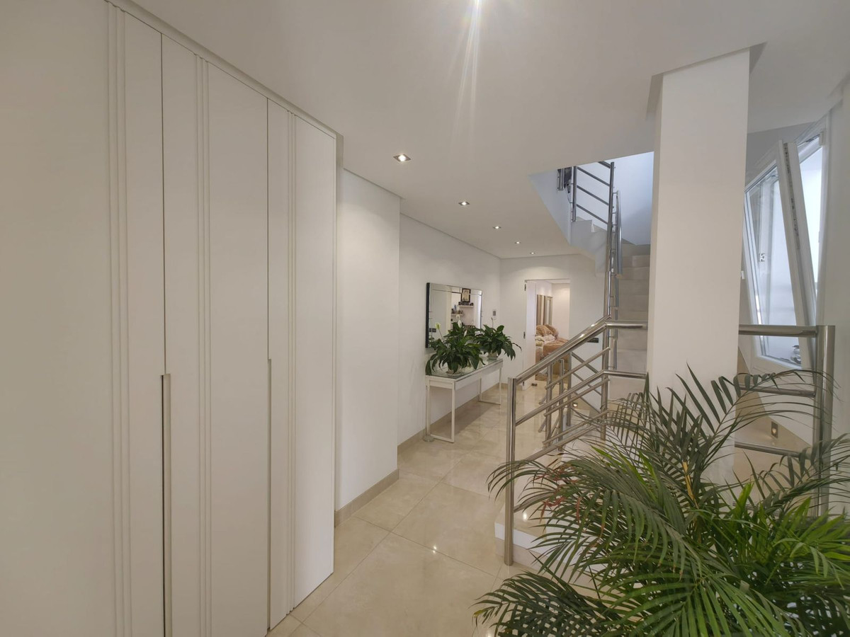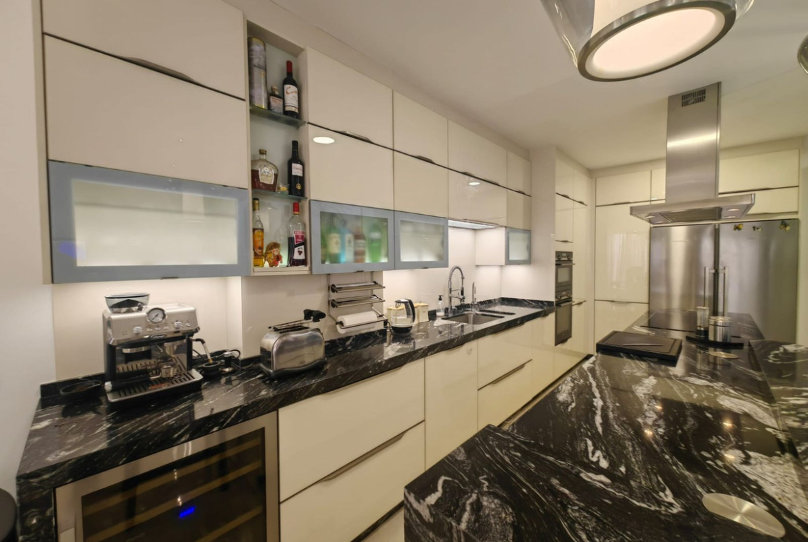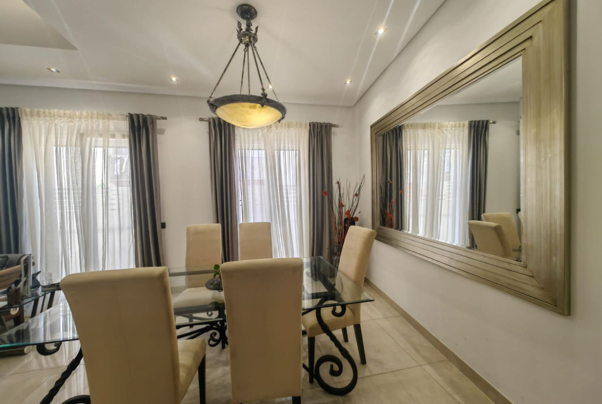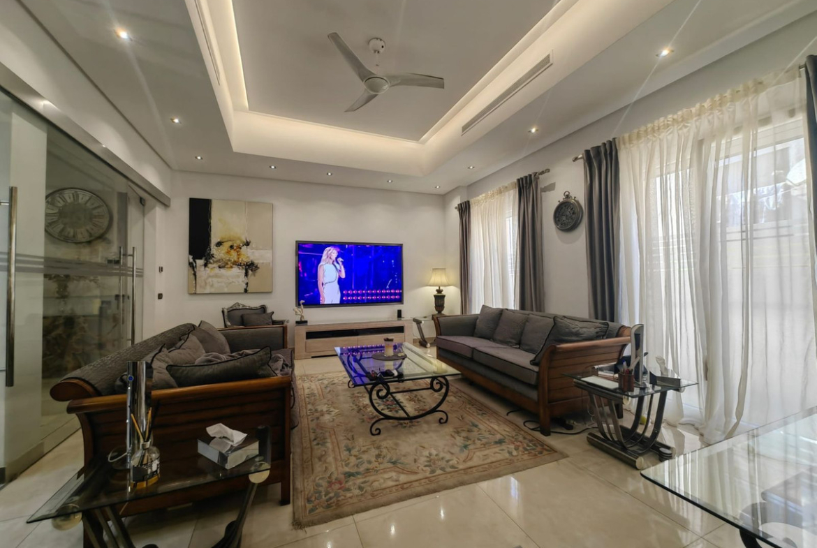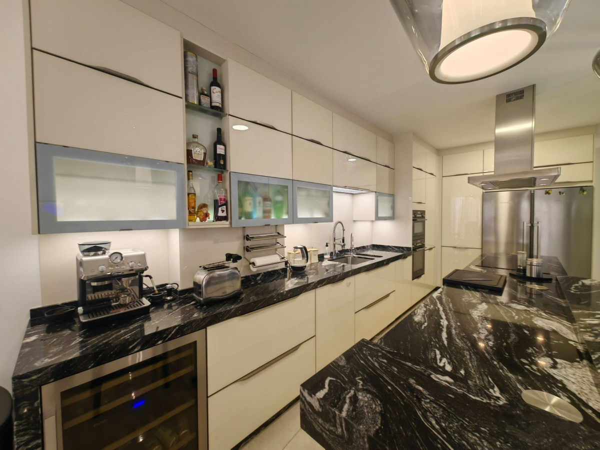 A central feature of the home is the dramatic atrium, rising all the way to the glass rooftop and acting as the light-filled core of the villa. A wide glass door opens into a spacious lounge and TV area, dining room, and a designer Schmidt kitchen fitted with top-of-the-line appliances including a Liebherr refrigerator. This entire floor is bathed in daylight, offering seamless flow and openness.