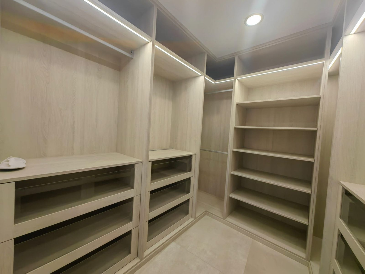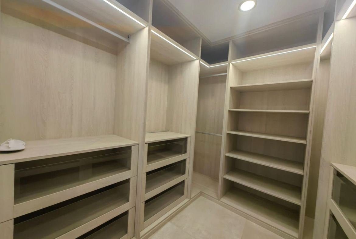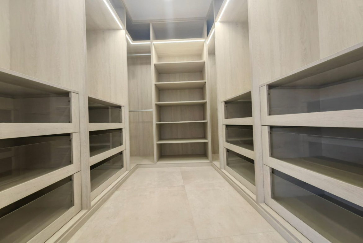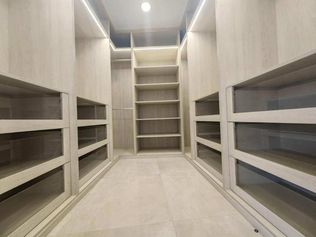 The first main bedroom suite features its own walk-in wardrobe, ensuite bathroom, and access to a wide passageway with extensive built-in storage. The highlight here is the entertainment terrace, blending covered and open-air spaces and equipped with plasma screen, BBQ, second kitchen, LED lighting, and laundry room. It's a space made for alfresco living under the sun or stars.