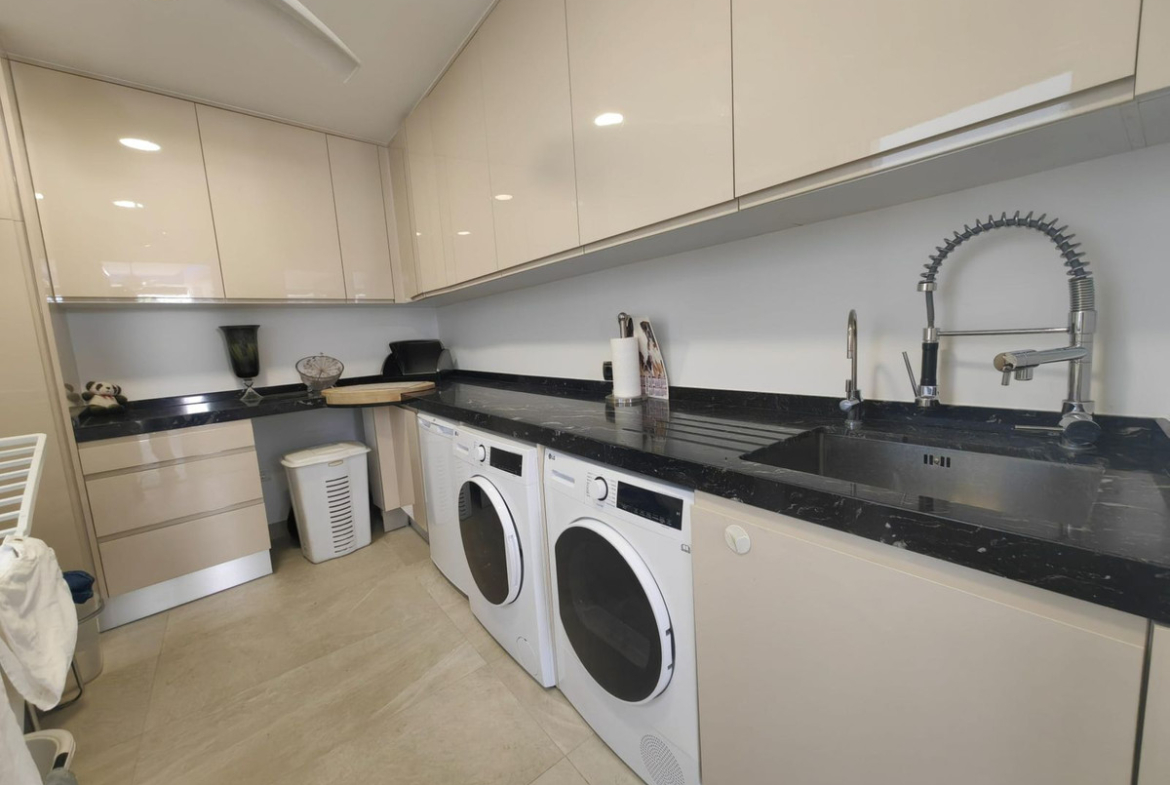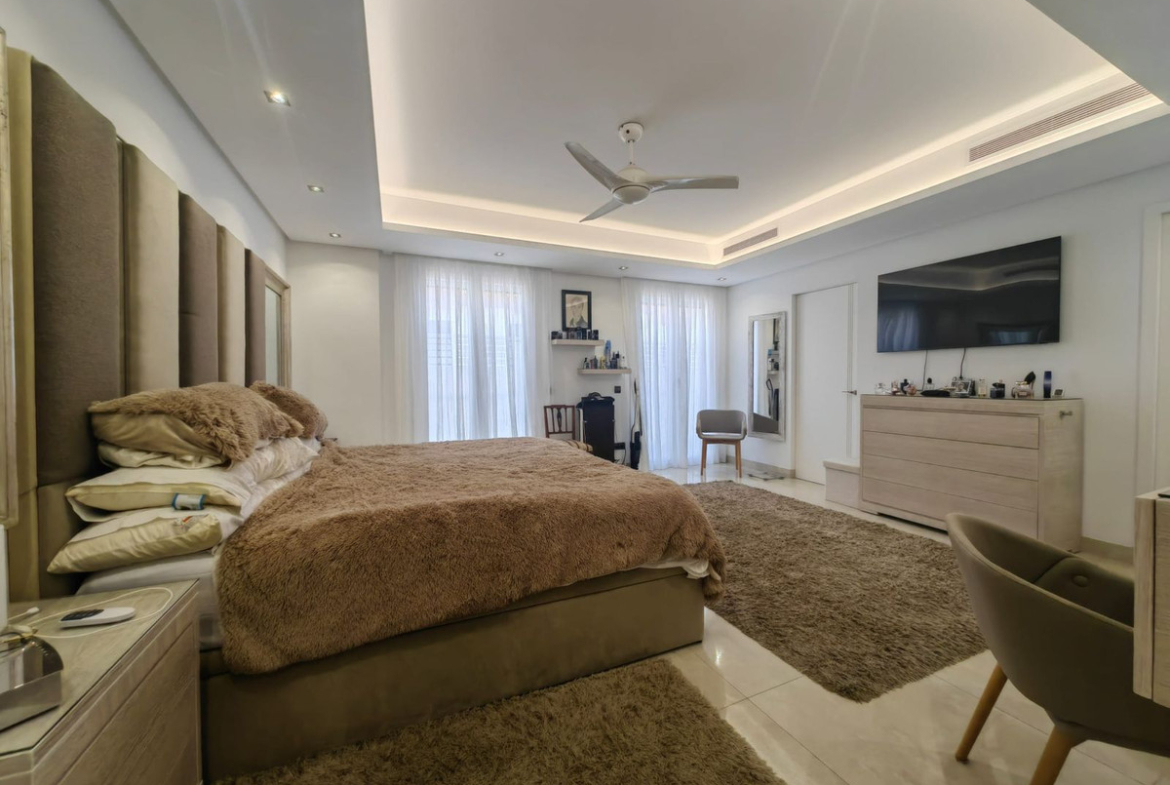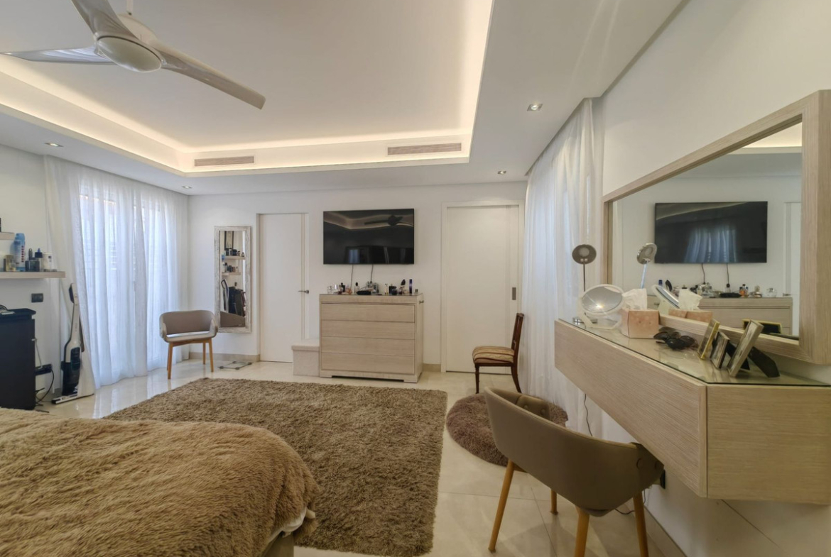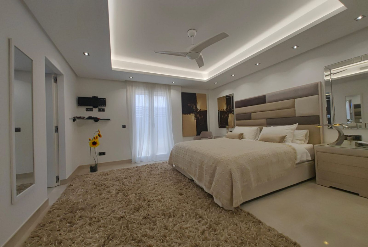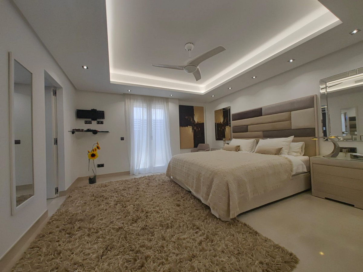 The first main bedroom suite features its own walk-in wardrobe, ensuite bathroom, and access to a wide passageway with extensive built-in storage. The highlight here is the entertainment terrace, blending covered and open-air spaces and equipped with plasma screen, BBQ, second kitchen, LED lighting, and laundry room. It's a space made for alfresco living under the sun or stars.