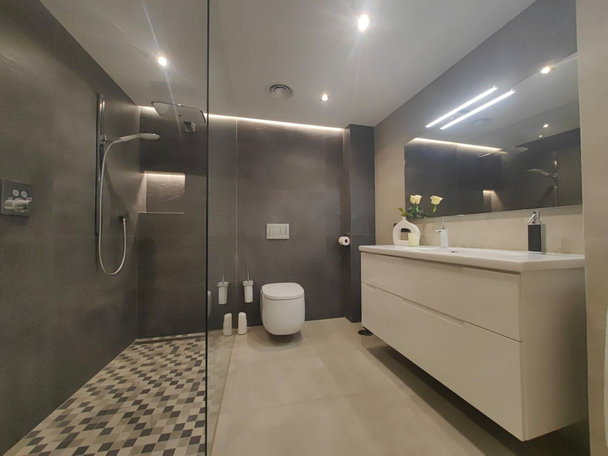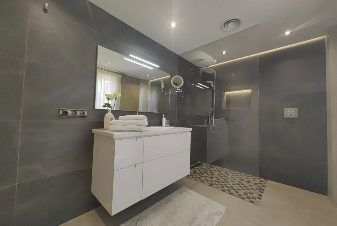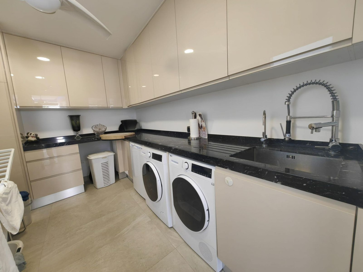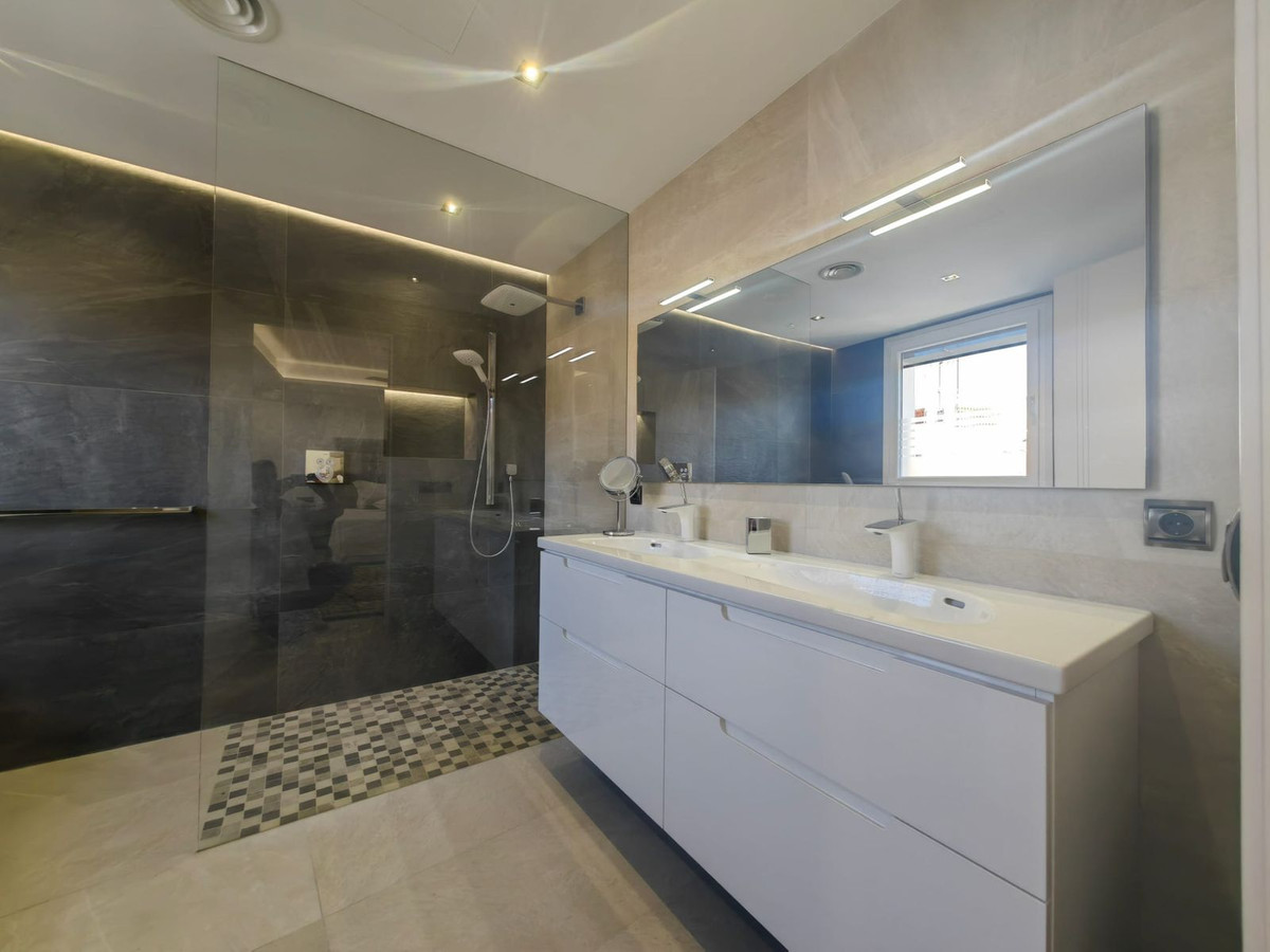The first main bedroom suite features its own walk-in wardrobe, ensuite bathroom, and access to a wide passageway with extensive built-in storage. The highlight here is the entertainment terrace, blending covered and open-air spaces and equipped with plasma screen, BBQ, second kitchen, LED lighting, and laundry room. It's a space made for alfresco living under the sun or stars.