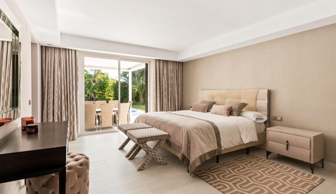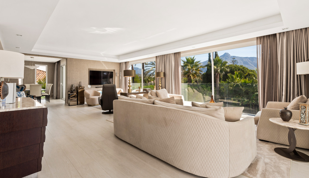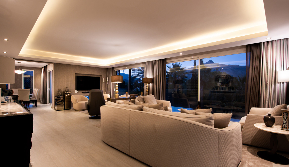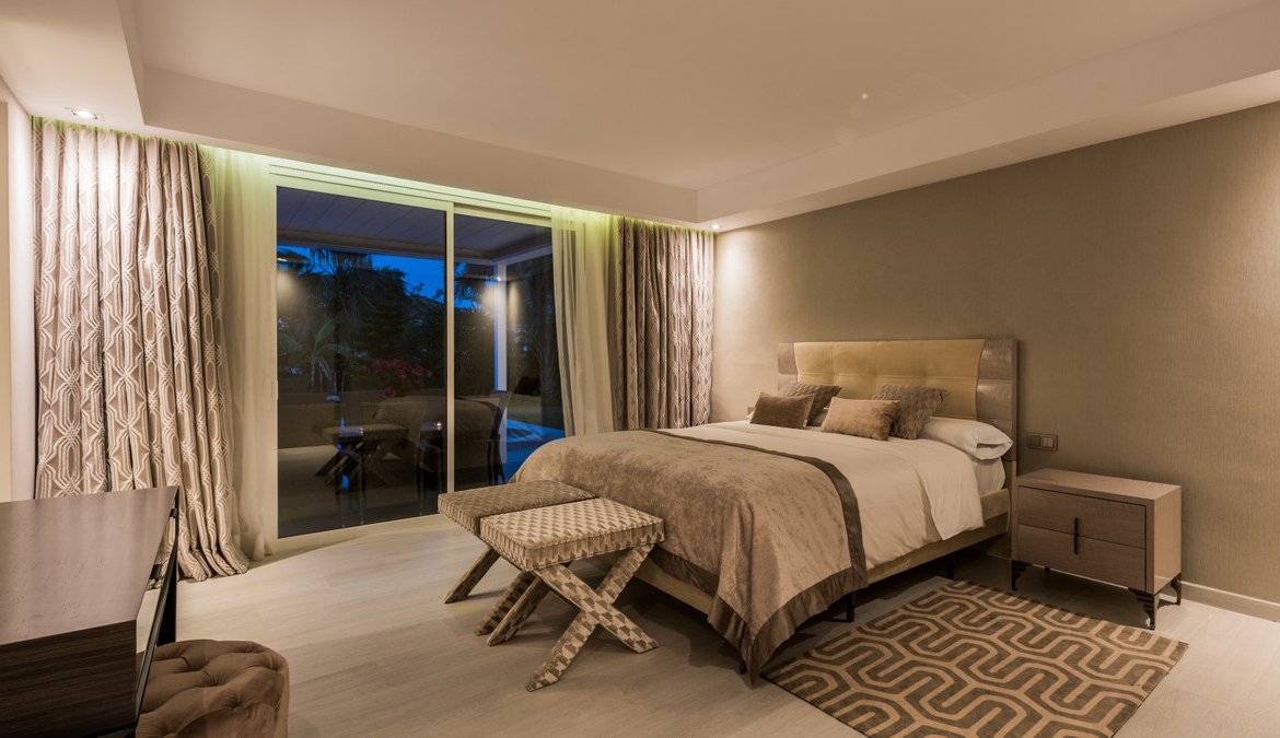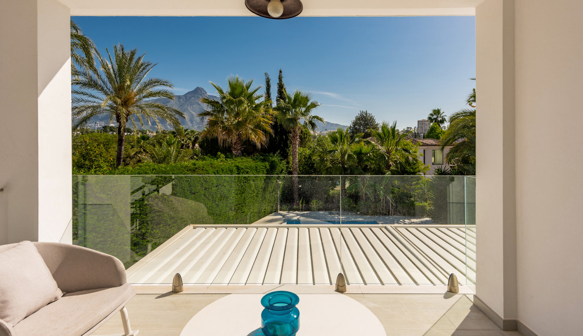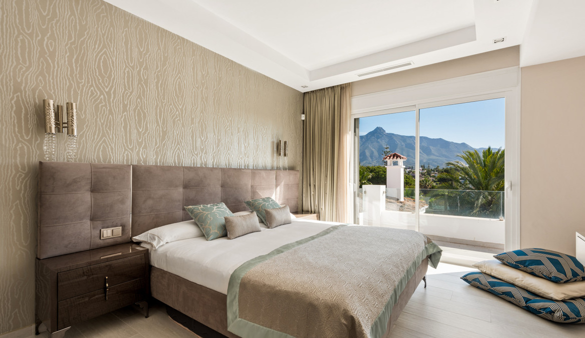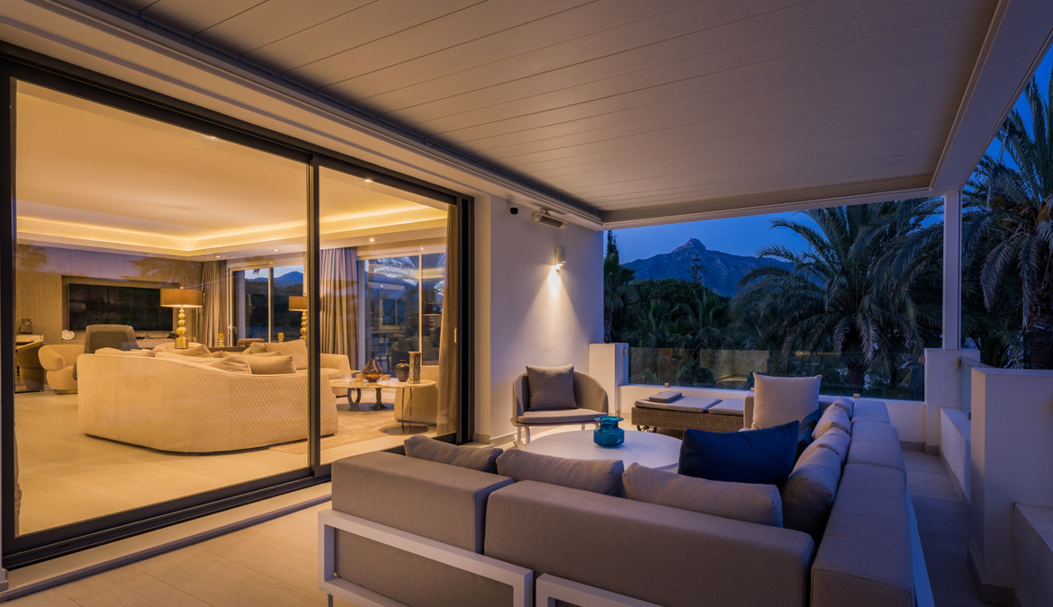 On the entrance level is a spacious lounge and to the left is a modern luxury kitchen with the best fittings and an open plan dining area which leads out to a terrace with a lovely view of "La Concha" mountain. On this level there is a guest WC and a laundry room just off the kitchen. The living room has an electric fireplace and large windows with views to "La Concha" mountain and another large terrace with a roof which can be open or closed.