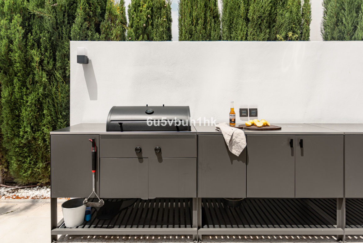 The outdoor terrace of 190m² is designed to maximize the villa’s privileged setting. It features a heated infinity pool, a fully equipped barbecue area, a shaded pergola for al fresco dining, and a comfortable chill-out space—all with breathtaking views over the sea and the African coastline. The villa features a beautifully landscaped garden with an automatic irrigation system, located directly in front of the pool area. Mature trees and well-established plants create a lush, serene environment, offering both privacy and natural beauty throughout the year.