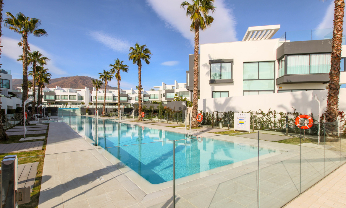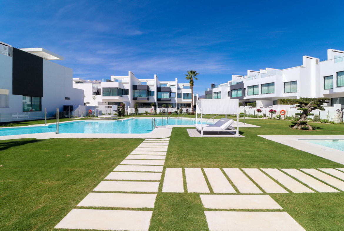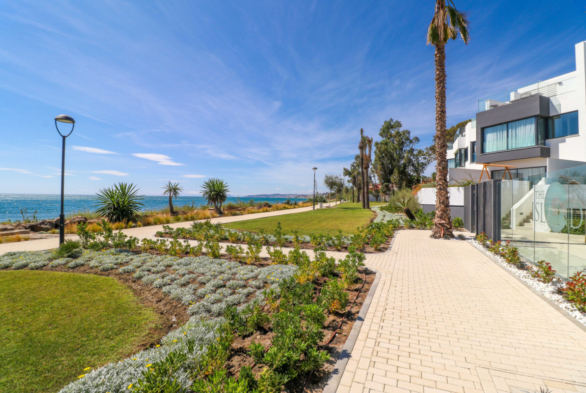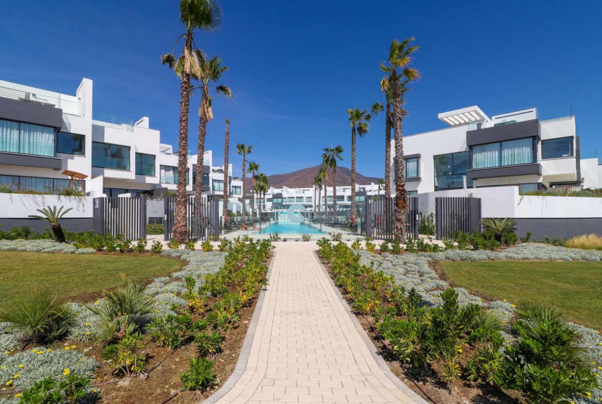 Modern and luxurious townhouse with 4 bedrooms brand new on the beachfront on the New Golden Mile of Estepona, being only twenty minutes from Puerto Banús and Marbella. The community has beautiful tropical gardens, swimming area, with a fifty-meter Olympic pool, and a spa circuit with sauna and Turkish bath. The house has a private roof terrace with fantastic sea views, jacuzzi and barbecue area, large living room with fireplace, fully equipped kitchen. It is equipped with underfloor heating, air conditioning hot / cold, security shutters and double glazing.