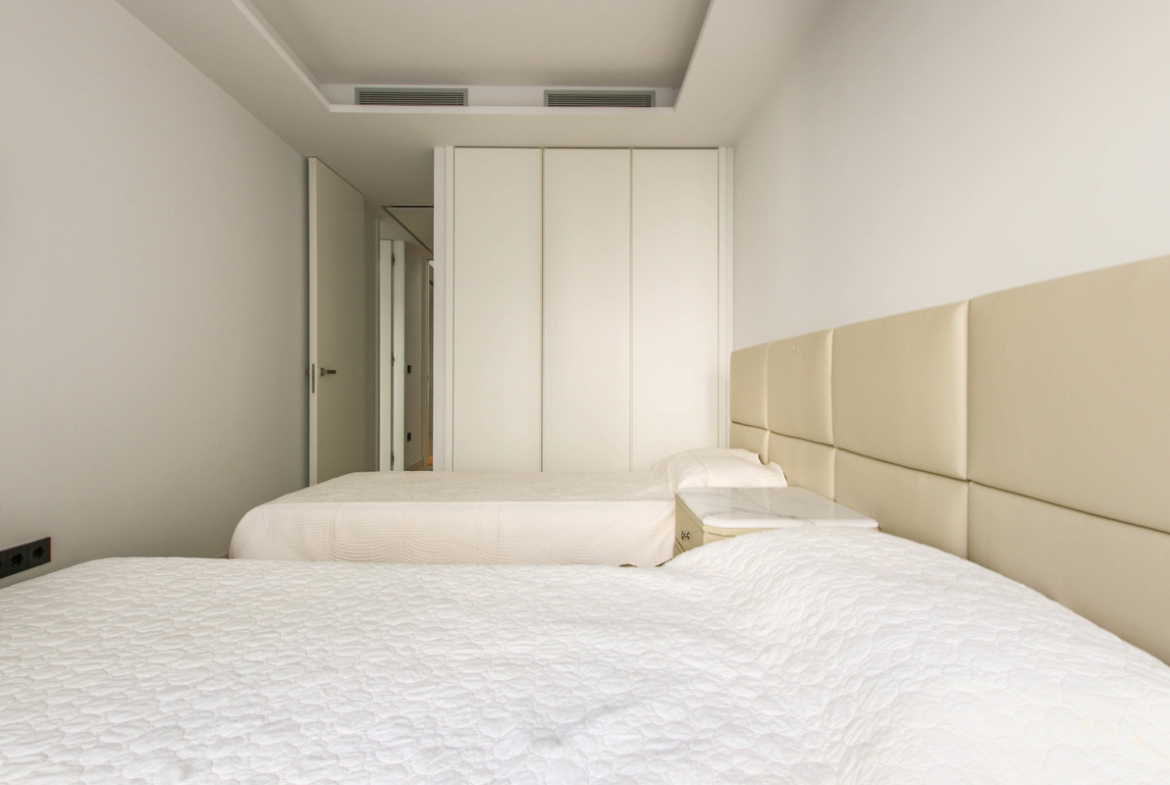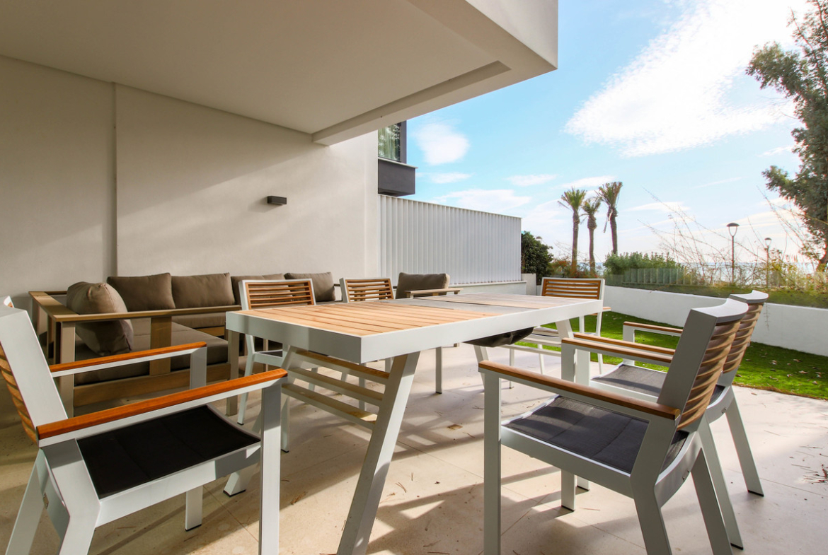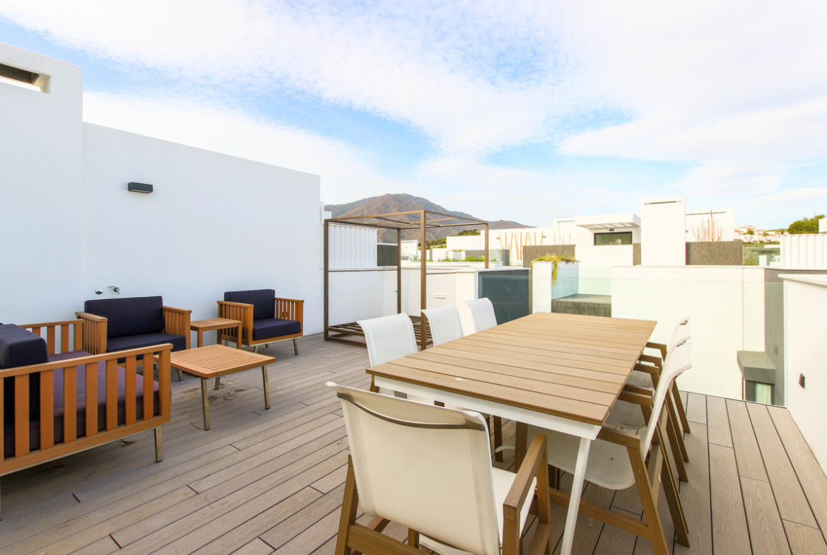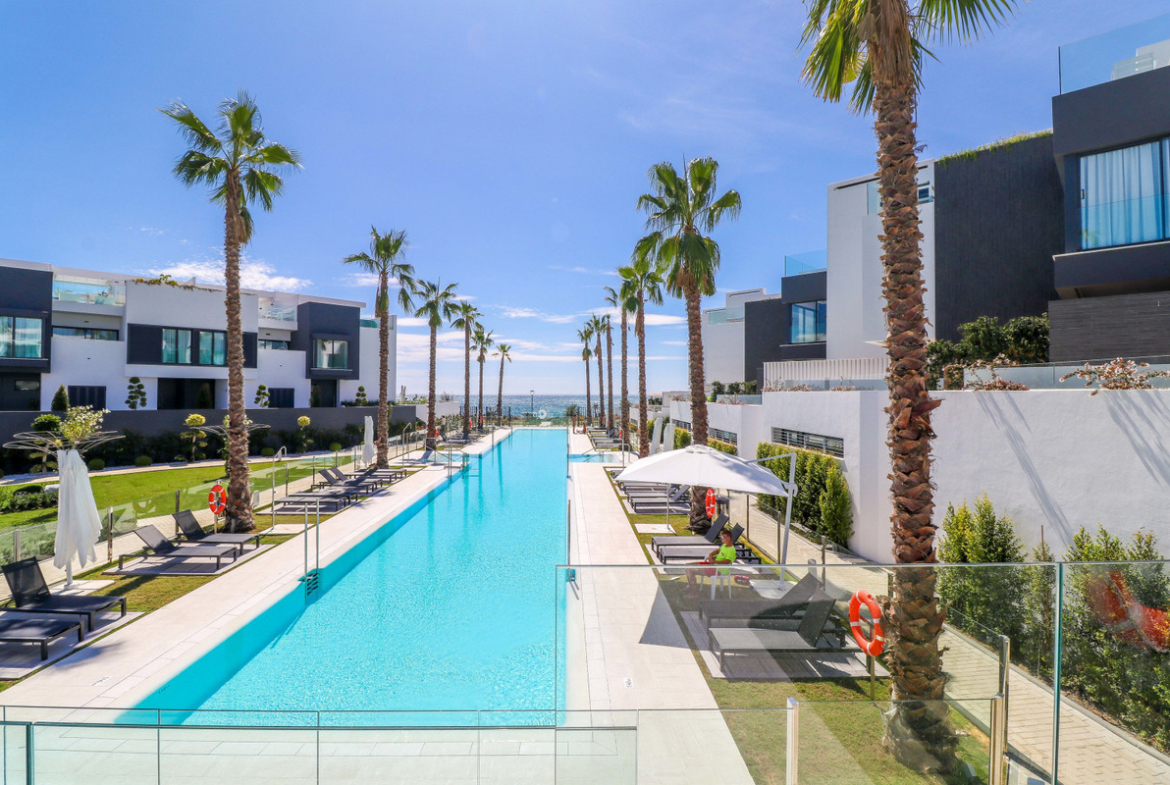 Modern and luxurious townhouse with 4 bedrooms brand new on the beachfront on the New Golden Mile of Estepona, being only twenty minutes from Puerto Banús and Marbella. The community has beautiful tropical gardens, swimming area, with a fifty-meter Olympic pool, and a spa circuit with sauna and Turkish bath. The house has a private roof terrace with fantastic sea views, jacuzzi and barbecue area, large living room with fireplace, fully equipped kitchen. It is equipped with underfloor heating, air conditioning hot / cold, security shutters and double glazing.